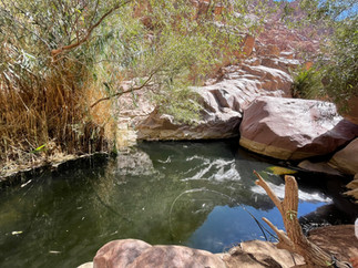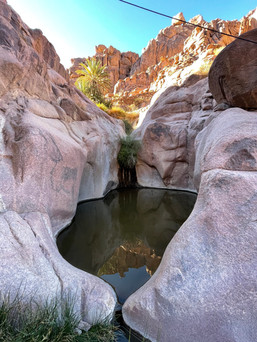 Obwohl es in der Nacht bittere 10 Grad kalt war, ist es jetzt an der Sonne angenehm warm. Der Weg führt uns durch die wunderschöne Wüstenlandschaft, vorbei an riesigen Felsen, Bergen, grünen Gärten und sandigen Flächen. Mal führt uns der Beduinen-Guide den steilen Berg hinauf, dann geht es über steinige Wege ins nächste Tal. Die Strecke ist ein wenig anspruchsvoll, aber wir werden von einer unglaubliche schönen Kulisse belohnt. Wir steigen den Berg hinunter und finden ein wunderbares Wasserloch. Schnell schlüpfen wir aus unserem Kleidern und hüpfen ins kühle Nass.